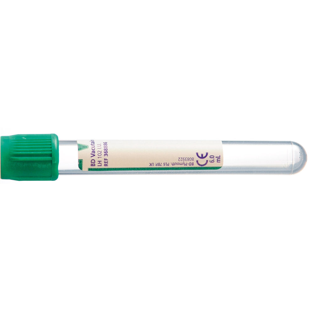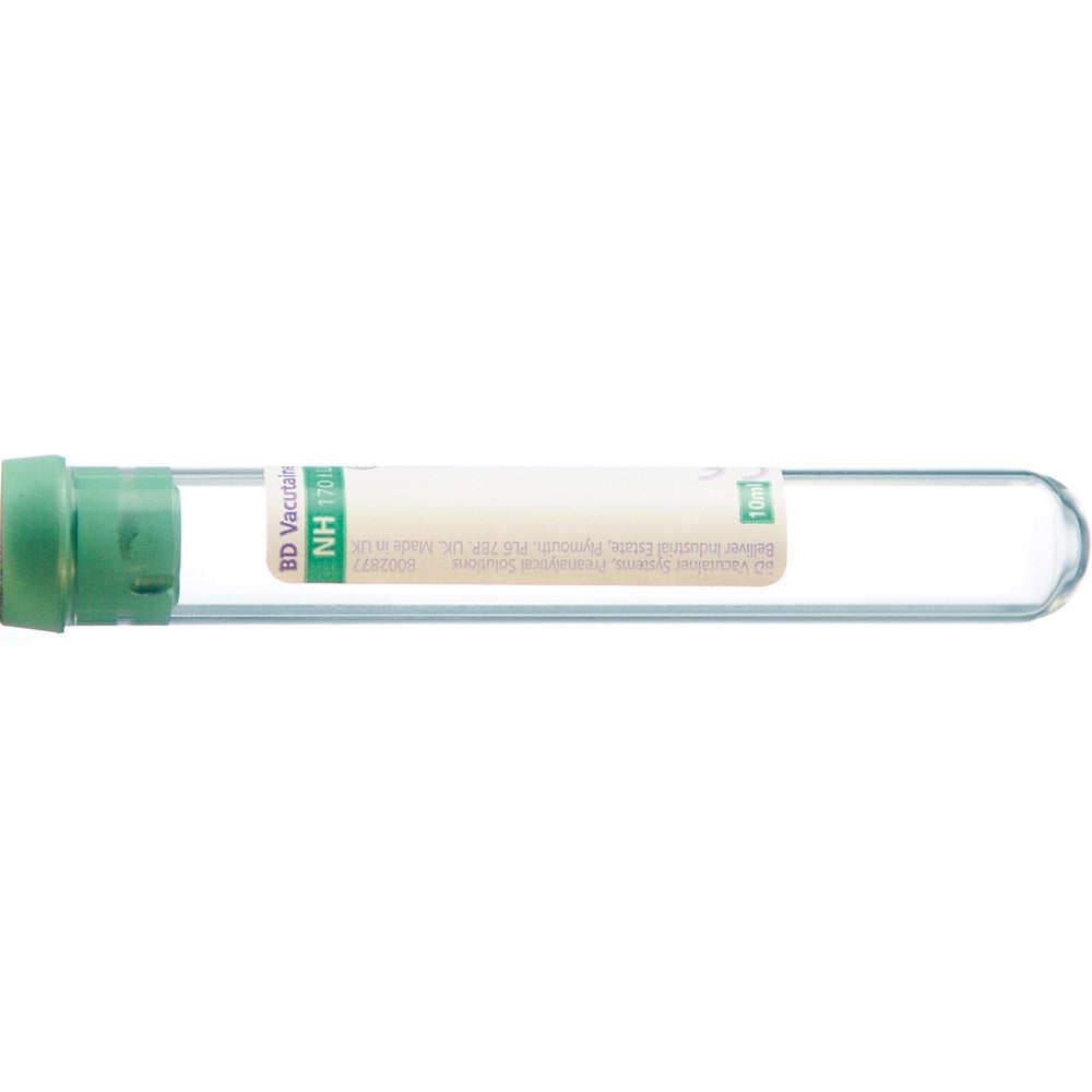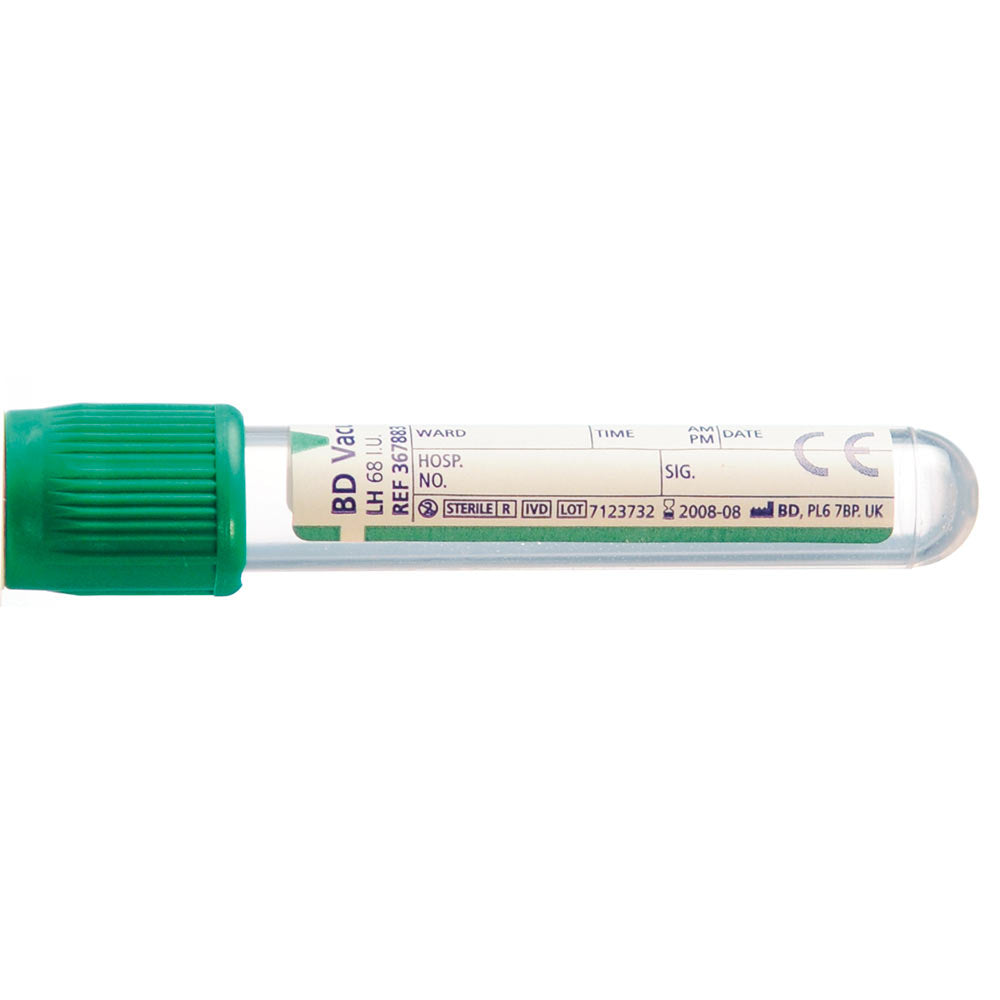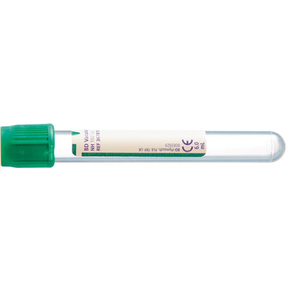 BD Vacutainer® Heparin plasma tubes are available with spray-dried sodium heparin or lithium heparin additives. Heparin acts as an anticoagulant as it develops an antithrombin complex which inhibits thrombin and the activated factor X and thus prevents coagulation. The optimum anticoagulation is achieved in all BD Vacutainer® tubes by the use of 17 IU pharmaceutical grade heparin per mL of blood when the fill level is correct. The lithium heparin in BD Vacutainer® tubes is spray dried onto the inner walls of the tubes using a special procedure so that the additive is evenly distributed to achieve the best possible solubility.