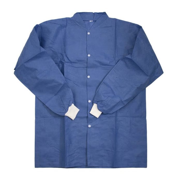 The scrubs jacket is manufactured from durable and soft spunbond Polypropylene, with a layer of meltdown material to provide repellence to low surface tension fluids such as blood.