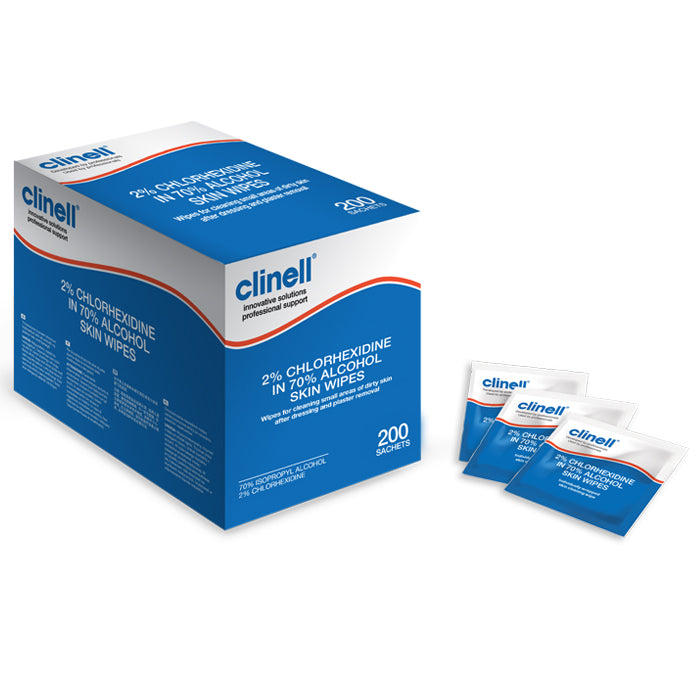 Clinell 2% Chlorhexidine in 70% Alcohol Skin Wipes are individually wrapped, single-use pre-saturated wipes designed for cleaning small areas of skin after dressing and plaster removal, especially where there is a build-up of stubborn adhesive residue. In certain countries, it can be used as part of a medical procedure, e.g. as a pre-injection swab, according to local regulations.