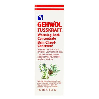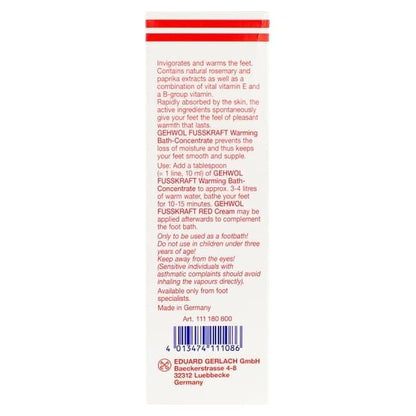 Soothe and revitalise tired, cold feet with Gehwol Fusskraft Warming Bath Concentrate. Infused with natural extracts of rosemary, paprika, and ginger, this concentrated foot bath provides an instant and long-lasting warming effect while promoting healthy circulation. The nourishing blend of vitamin E, B-group vitamins, and emollients helps to prevent moisture loss, leaving feet smooth, supple, and refreshed. Ideal for those who suffer from cold feet, excessive foot sweat, or foot odour, this dermatologically tested formula is suitable for diabetics and free from parabens and gluten.