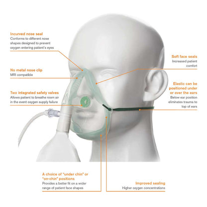 The adult high concentration oxygen mask from Intersurgical, also known as adult non-rebreathing masks can provide oxygen at a flow rate of between 10-15Ltr p/m in concentrations up to 80%.