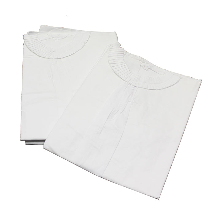 A traditional shroud produced in 100% bleached cotton calico fabric. All fabric edges are clean cut rather than hemmed, when dressing the deceased the raw cloth edge is simply folded back on itself out of sight. Self-material ties are provided at both the neck and wrists.