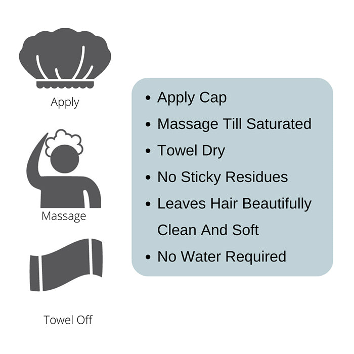 To use: Place No Rinse Shampoo Cap on to the scalp tucking in all strands of hair, massage until hair feels saturated, remove and towel dry. Once dried style as normal.