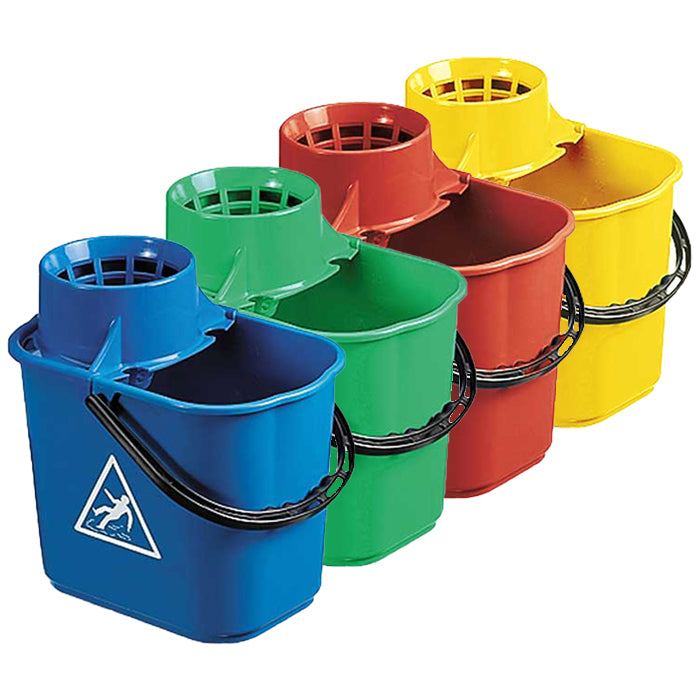 Superb quality mop bucket with raised cone wringer which can withstand vigorous wringing of the mop by the user. This bucket is made completely from plastic and is very strong so you can be assured of a good investment. Available in the 4 hygiene colours and complete with printed ‘caution wet surface’ symbol. Suitable for socket mops, RHP, Optima 200-300g and all white mops.