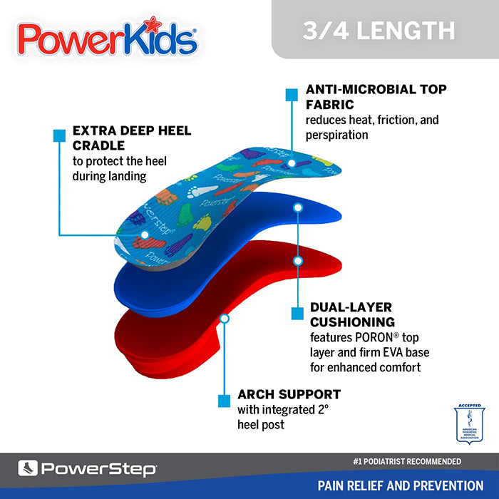 Powerstep PowerKids Junior Insoles provide comfort and support for the growing pediatric foot. Flat feet are common with children as their bones and joints develop, this is commonly overlooked until later on in life when more serious foot conditions emerge.