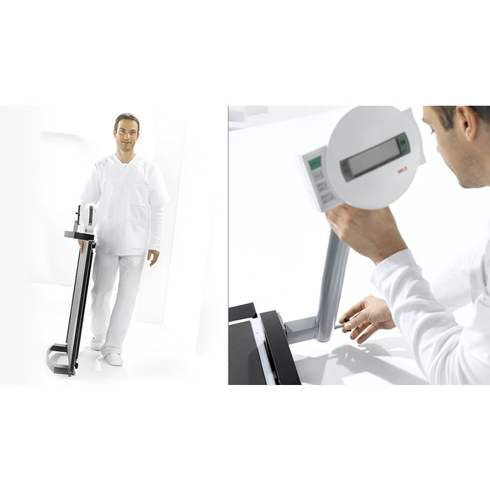 The wireless capability of the Seca 665 makes the scale compatible with Seca's 360 wireless system. The easy-to-read swiveling LCD display with large figures is packed with functionality including Print, Overload protection, Auto-Print, Tare, Auto-clear, Pre-Tare, Hold, Auto-Hold, BMI, Automatic switch-off, Send, Reset, and Auto-SEND. The Seca 665 can also be folded up and transported thanks to its roller castors.