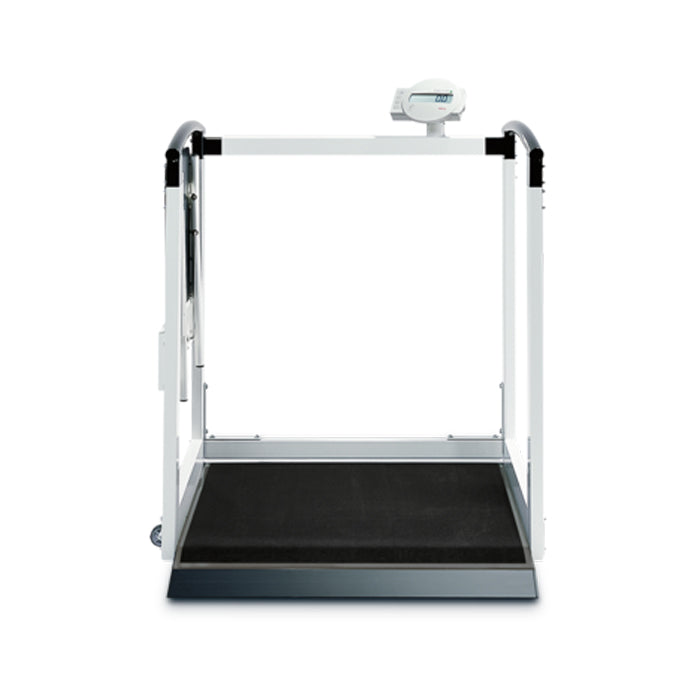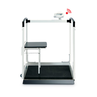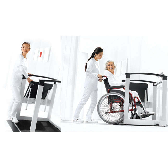 The Seca 685 wireless multifunction scales facilitate safe weighing while standing, sitting or in a wheelchair without having to be converted to suit the patient. When standing the patient is supported by a stable handrail, when sitting by an integrated folding seat and in a wheelchair by a large platform (76 x 82cm) - the weight of the wheelchair is simply tared away by the pre-TARE function.