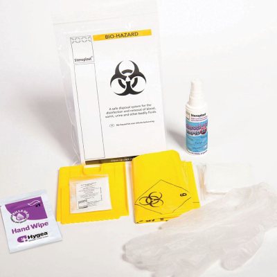 - This comprehensive biohazard bodily fluid cleanup kit is designed to be used throughout hospitals, clinics, dental surgeries, laboratories, veterinary practices, and by first aid personnel in offices, care homes, and schools.