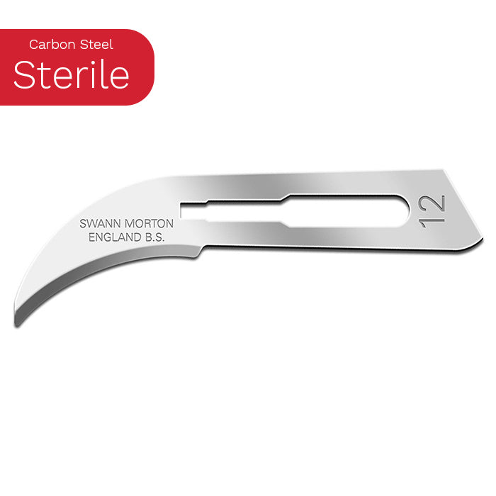 The Swann Morton No. 12 sterile surgical blade features a small, pointed, crescent shaped blade sharpened along the inside edge of the curve. This blade is often utilised as a suture cutter but is also suitable for the following procedures: