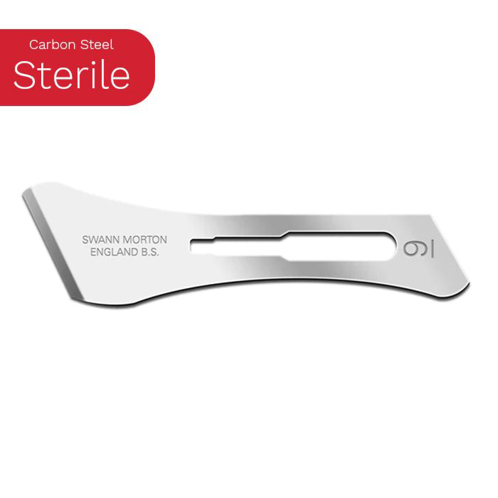 The Swann Morton No. 9 sterile surgical blade features a broad, "hatchet" shaped blade that is utilised by podiatrists.