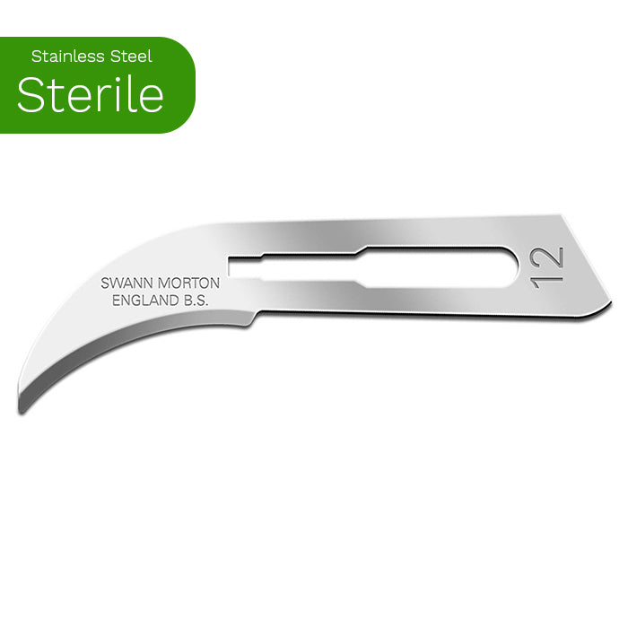 The Swann Morton No. 12 sterile surgical blade features a small, pointed, crescent shaped blade sharpened along the inside edge of the curve. This blade is often utilised as a suture cutter but is also suitable for the following procedures: